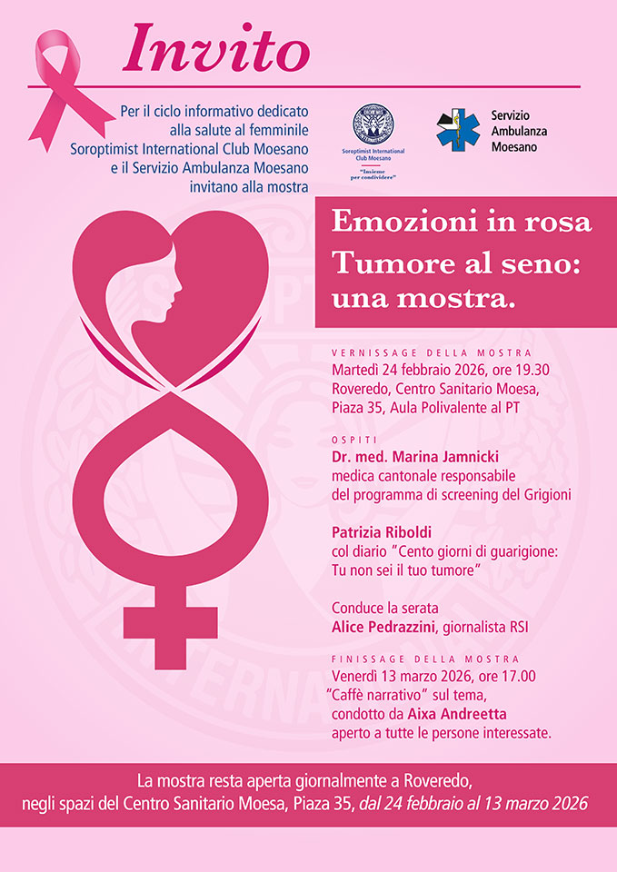 Il Soroptimist Club Moesano, in collaborazione con il Servizio Ambulanza Moesano, presenta l’evento “Emozioni in Rosa”: una mostra fotografica accompagnata da libri e da una tavola rotonda dedicata al tema del cancro al seno. L’iniziativa si terrà negli spazi del Centro sanitario Moesa di Roveredo dal 24 febbraio al 13 marzo 2026.