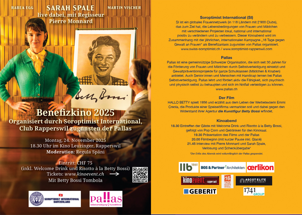 Der Club der Soroptimistinnen von Rapperswil veranstaltet als Auftakt der 16 Tage „Gemeinsam gegen Gewalt an Frauen » einen Benefiz-Kinoabend, dessen Gewinn zur Prävention von Gewalt in der Schweiz verwendet wird. In diesem Jahr haben wir entschieden, eine Organisation zu unterstützen, welche auch vermehrt in der Gewaltprävention, vor allem bei Jugendlichen, tätig ist: die Pallas.