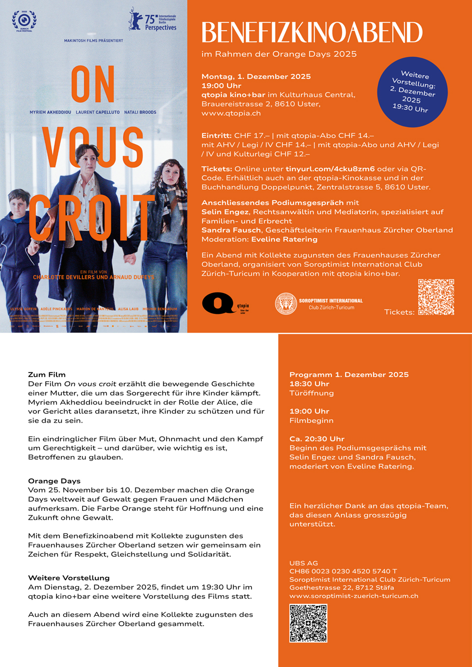 Ein Abend mit Kollekte zugunsten des Frauenhauses Zürcher Oberland, organisiert von Soroptimist International Club Zürich-Turicum in Kooperation mit qtopia kino+bar.