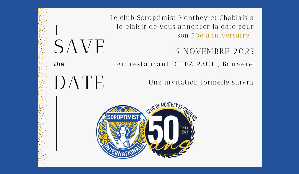 Le club Soroptimist Monthey et Chablais a le plaisir de vous annoncer la date pour son 50e anniversaire 15 NOVEMBRE 2025 Au restaurant “CHEZ PAUL”, Bouveret. Une invitation formelle suivra.