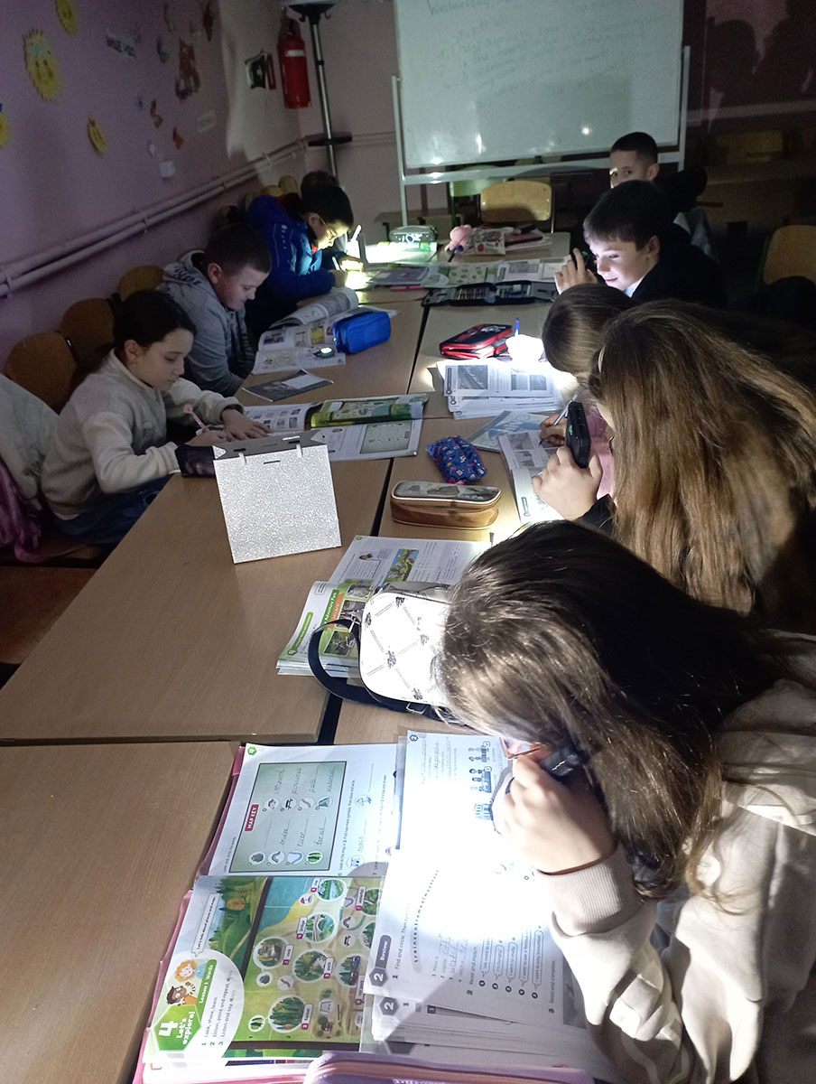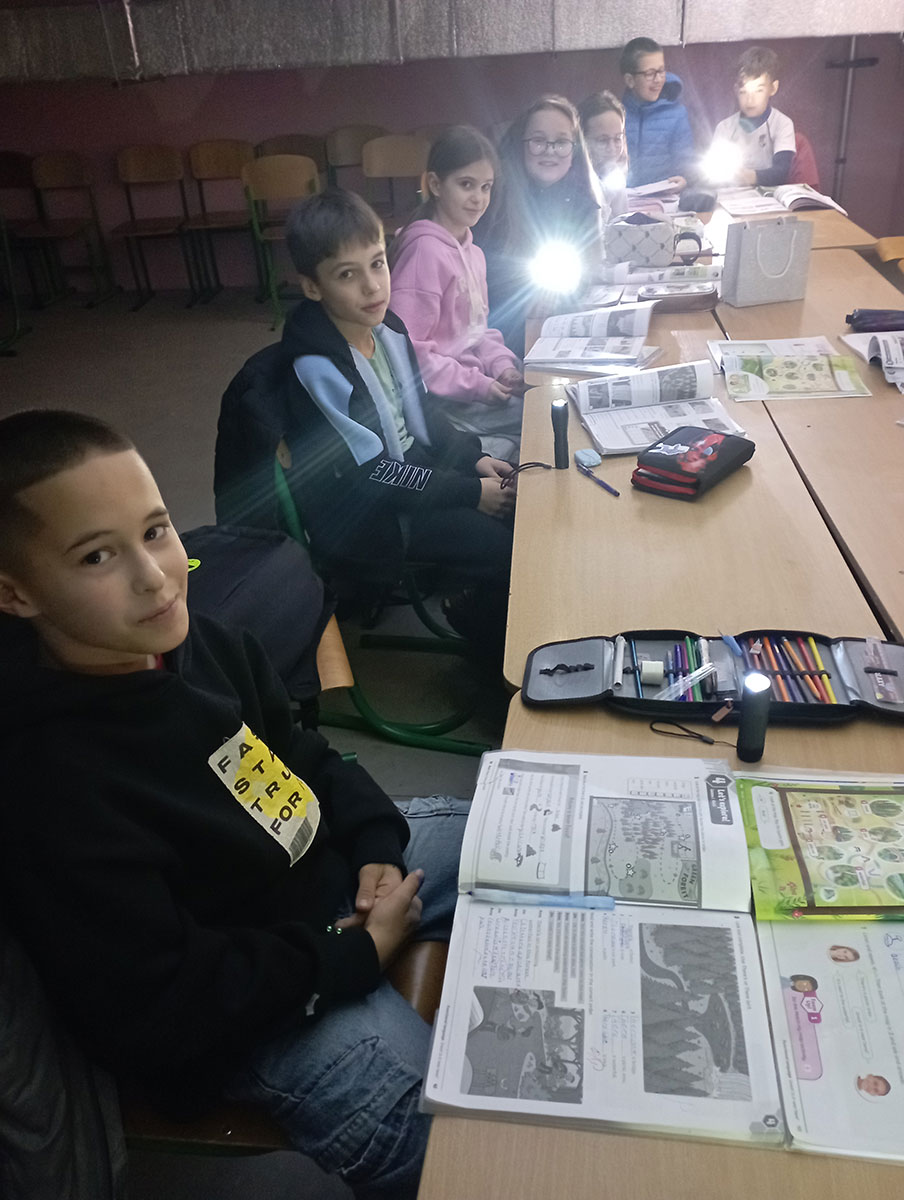 Jetzt, während ich Pias Fragen beantworte, haben wir wieder Alarm und bald wird der Strom ausfallen. Wir werden ohne Verbindung und ohne Heizung sein und psychischer Gewalt ausgesetzt sein. Die untenstehenden Fotos zeigen, wie ich bei Alarm den Unterricht im Keller ohne Strom abhalten muss.