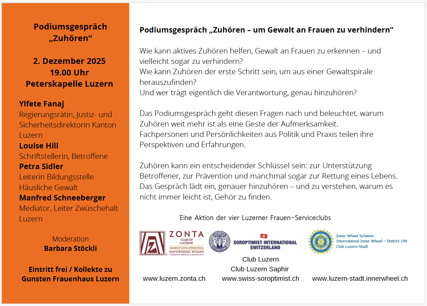 - Benefiz Anlass am 4. Dezember 2025 im Museum Gertsch, Burgdorf mit dem Referat von Frau Simonetta Sommaruga: „Der gefährlichste Ort für Frauen“. Museumseintritt und Apero im Eintrittspreis von CHF 35 inbegriffen. Anmeldung gemäss Flyer. Einnahmen gehen an die Stiftung gegen Gewalt an Frauen und Kindern, Bern.